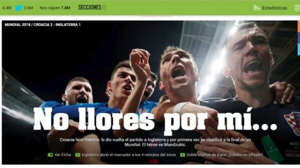 "No llores por mí": Así reaccionó la prensa mundial por el hito croata y la caída inglesa 11/07/2018 Croacia pasó a la final del Mundial de Rusia 2018 tras batir a Inglaterra y la prensa mundial destacó el hito de los balcánicos, aunque los argentinos también hicieron eco de la derrota de los ingleses con una irónica portada: "No llores por mí"...